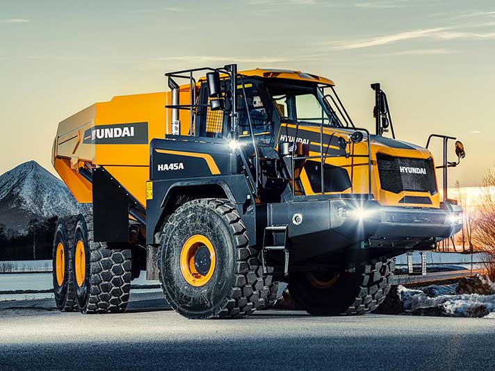 The new Hyundai HA45A A-Series ADT delivers the ultimate in manoeuvrability, safety, comfort and low cost in a highly productive 45 tonne machine. Based on a proven design with 50 years heritage, it has many features that sets it apart. A tandem rear axle and independent front wheel suspension makes it more manoeuvrable, safe and comfortable, while a sloping rear frame that guides loads to the front, increases traction for greater productivity. With ground level service access and one of the biggest cabs in the industry, the HA45A fits perfectly alongside our large excavator and wheel loader A-Series machines.